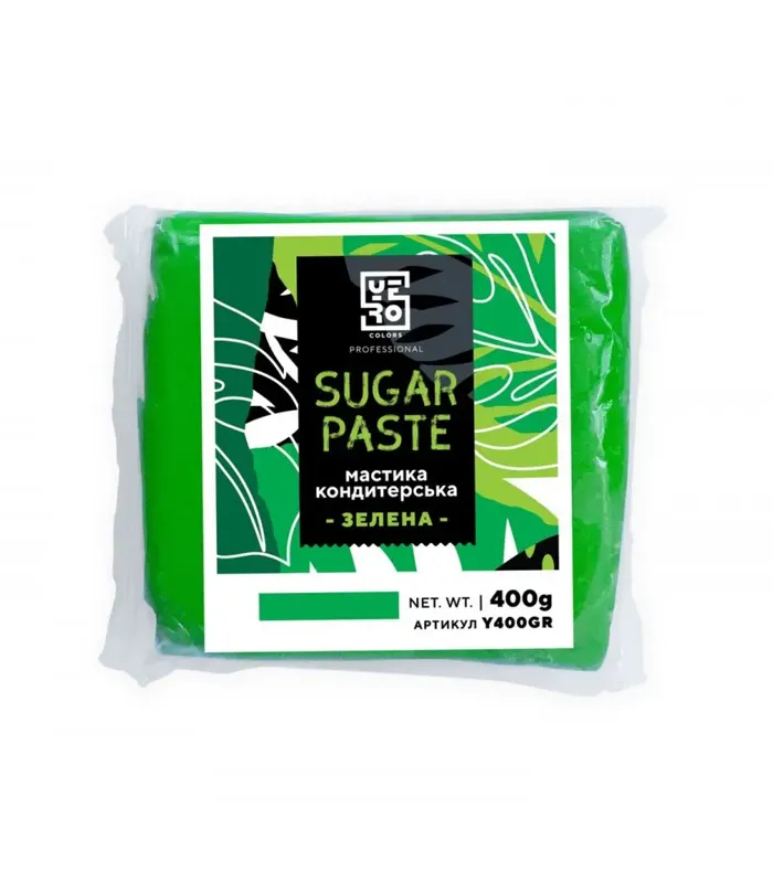 Мастика кондитерська Зелена Yero colors чудово підходить для покриття тортів, створення квітів, декоративних елементів, фігурок та інших кондитерських прикрас. Паста має приємну текстуру, не тріскається під час роботи та легко фарбується харчовими барвниками.