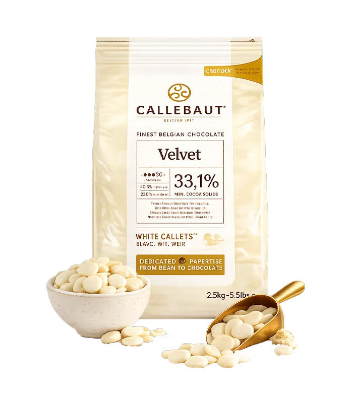 Белый шоколад Callebaut Velvet имеет насыщенный, но в то же время легкий вкус сливок и молока со сладким привкусом. В составе пониженное содержание сахара.